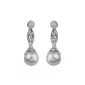 6mm pearl and 0.095 CT. T.W. diamond cluster drop Earrings in 14K White Gold. Push back. Pave set. H-J colour. I1-I3 clarity. Certificate of Diamond Authenticity is available. Complies with Prop 65.