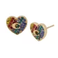 Heart stud earrings featuring signature C motif and adorned with rainbow colored pave. Earrings are set in polished gold-tone brass metal and have a post back closure.
