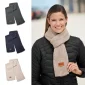 This scarf is made of heathered rayon, fiber, polyester and nylon on a trellis pattern. Includes a faux Leather Thermo PU patch and measures 1.96"W x 1.18"H. Hand-wash only. Do not iron. 65" L x 10" W