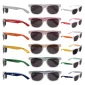 Clear classic frames with colored arms provide an updated and stylish presentation. Pricing includes a full or partial arm imprint on both arms. Each pair of sunglasses provides 100% UV protection and features shatter resistant lenses. Complies with ANSI, FDA. 6" L x 6" W x 1 3/4" H