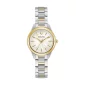 Two-tone stainless steel case and bracelet with a silver white dial featuring gold-tone hands and markers. Domed mineral crystal. Short fold over buckle closure. Complies with Prop 65. 28mm Diameter