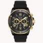 Features six-hand chronograph six hand chronograph with calendar in ion plated and stainless steel with dial, flat mineral glass, screw-back case, silicon strap with 3-piece buckle closure. Water resistance of 100 meters and comes with a 3 year warranty. 44mm Diameter x 24mm W