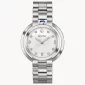 Legendary heritage reinvented in stainless steel case with synthetic spinel cabochon crown at 12 o'clock position and diamonds individually hand set on a textured dial. Features a double curved sapphire crystal, a stainless steel bracelet with double-press deployant closure, an iconic dye struck "Goddess of Time" dimensional case back, and water resistance to 30 meters. Comes with a 3 year warranty. 35mm Diameter x 7mm W