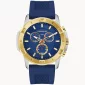 Form and function, no compromise needed. Two-tone stainless steel case with a unidirectional rotating bezel. Wave inspired dial texture with luminous hands and markers. Six-hand chronograph movement. Silicone strap with three-piece buckle closure. Water resistance of 100 meters and comes with a 3 year warranty. 44mm Diameter x 24mm W