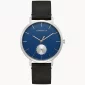 Contemporary style. Stainless steel case with the dial featuring a new movement with a 24-hour sub dial at the six o'clock position. Has a leather strap with contrast safety stitch to match the dial. Strap is finished with a square edge for a more casual feel. Water resistance of 30 meters and comes with a 3 year warranty. 39.5mm Diameter x 18mm W