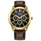 The ion plated stainless steel case is the perfect base for the watch's dial, with three sub-dials upon a textured inner sector adding to its distinct appeal. Applied accents and a leather strap round out the look, with features including 12/24-hour time and analog day/date indicators to balance the aesthetics with the functionality of this sophisticated timepiece. Sustainably powered by any light with our Eco-Drive technology. Water resistance of 100 meters and comes with a 5 year warranty. 40mm Diameter x 20mm W