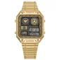 Inspired by an original CITIZEN® analogue-digital watch from the 1980s, this ion plated stainless steel rectangular case watch is packed with features, including dual time and two analogue sub-dials. This timepiece also features a 1/100-second chronograph that measures up to 24 hours, a perpetual calendar, temperature display, an alarm, and digital display. Introducing sleek screw details on the bezel, a tapered bracelet design. Water resistance of 50 meters and comes with a 5 year warranty. 34mm L x 40mm H x 15mm W