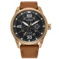 CITIZEN WATCHES Avion Weekender. A vintage look from a bygone era, combined with modern technology, make the men's Avion Weekender timepiece from CITIZEN WATCHES the watch to wear. This traditionally styled watch features a rose gold-tone stainless-steel case that holds a black three-hand dial with date. The rich brown leather strap with buckle completes the nostalgic look. Complies with Prop 65. 45mm Diameter