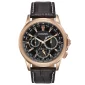 The CITIZEN WATCHES Calendrier reflects a timeless sophistication featuring 12/24-hour time, world time in 24 time zones and day/date. Shown in a rose gold-tone stainless steel case with a dark brown leather strap and a black dial. Case Diameter 44mm. Water Resistance 100M. Deployment Clasp with Push Button. Complies with Prop 65. 44mm Diameter