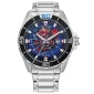 CITIZEN WATCHES MARVEL. Marvel's Spider-Man takes centre stage on this new inspired CITIZEN WATCHES timepiece that is sure to get your Spidey senses tingling. The silver-tone stainless steel case and bracelet are complemented by a black bezel, creating an ultra-tough and striking look. The dial features a gradient blue background, with its darker periphery and brighter centre highlighting the illustration of Spider-Man, with three silver-tone hands and a bright white date aperture at 3 o'clock. Complies with Prop 65. 44mm Diameter