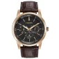 CITIZEN WATCHES CORSO. Clean lines instantly convey a look destined to become a classic. Featured in a rose gold-tone stainless steel case and a dark brown leather strap with a black metal dial, this timepiece is complimented by 12/24-hour time and analogue day/date features. Case Diameter 44mm. Water Resistance 100M. Buckle. Complies with Prop 65. 44mm Diameter