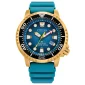 CITIZEN WATCHES PROMASTER. Explore the deepest depths with the latest Promaster Dive in a stylish new colour. This must-have diving watch vibrantly features a gold-tone stainless steel case, a turquoise 3-hand dial with date function, and luminous hands and markers. The durable, matching turquoise polyurethane strap with buckle closure completes the look for a comfortable fit. Complies with Prop 65. 44mm Diameter