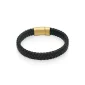 Steelx braided black leather bracelet with matte gold ip clasp. Length 8.5". Gift box included. Complies with Prop 65.