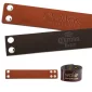 Stock leather bracelet with embossed logo in one location, with four snaps. Complies with Prop 65. 9" L x 1.5" W