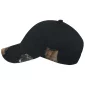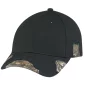 Enzyme washed, brushed polycotton/deluxe blended, chino twill camouflage cap features 6 panel constructed, contour distressed design, buckram laminated front panels with Pro-stitch, a pre-curved peak with contrast trim, black underpeak, and a self cloth back strap with Velcro closure.