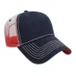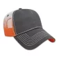 Gradient screen print mesh cap with low profile six panel structured cap, chino twill with mesh back, screen printed gradient on mesh with color matching undervisor, two-tone adjustable plastic snap tab.