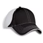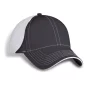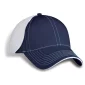 This structured, 8 section, premium cotton twill cap is made of 50% cotton/50% polyester. It features contrasting pineapple mesh curved side and back panels and sandwich peak insert, sweatband and taping, and a tab velcro closure. Imported