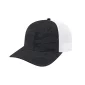 This medium profile six panel structured cap come with a modified flat visor made with a poly/spandex blend fabric with double mesh & UV protection featuring an adjustable plastic snap tab closure.
