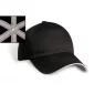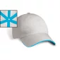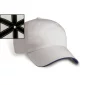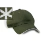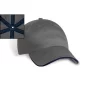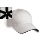 This unstructured premium cotton twill cap, with contrasting special sandwich peak, is made of 100% cotton. It is from the Prestige collection, and features a sweatband, taping and back strap, 6 sections, low fitting soft front, a pre-curved peak, contrasting adjustable self back strap, and an antique silver ring buckle. Imported.