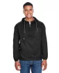 100% nylon; Water-resistant; Lightweight packable hooded pullover with quarter-zip entry; Drawstring hood; Front welt pockets; Center-zip pocket; Can be easily attached to belt when stored in pouch; Full elastic cuffs; Hem casing with drawcord;