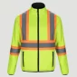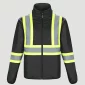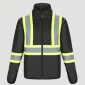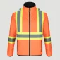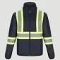 Features 100% polyester oxford outer shell with Polyurethane coating combined with taped seams for rainwear purposes. 4" band with reflective tape front and back in WSIB configuration. Reverse the garment to 100% polyester water repellant taffeta. Lightly insulated for transitional purposes and elastic binding at cuff and hem for fine finishing details.