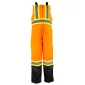 100% waterproof and windproof. 300 denier polyester laminated with polyurethane coating. Fabric insulated with 6 Oz. 100% polyester interlined with 100% polyester facing. Reflective stripes at the waist, at the back and at the legs with double sewing on the silver reflective stripe and on the yellow band. Two cargo pockets at the front, two back pockets, zipper with storm flap and rustproof snaps on each leg, and heavy duty suspenders with adjustable buckles. Reinforced at all points of strain. Complies with CSA.