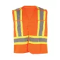 This traffic vest has 4" DYNA-LITE™ glass bead, CSA compliant reflective material and tough wear polyester material. The horizontal 360º stripe around the body plus vertical stripes in front and an "X" on the back providing the worker total protection as they move to be seen from all angles. It has 2 inside front pockets, 2 outside front pockets, and a D-ring hold in the back. It has a 5 point tear away Velcro® for added protection (tear away shoulders, sides and front). Complies with ANSI, CSA.