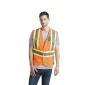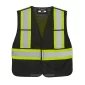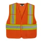 120 gsm – 3.5 oz./yd2 – 6 oz./lin. yd 100% polyester mesh. Upper left badge holder. 5 point tape fastener tear away safety design. 4 front storage pockets, Durable binding. D ring access slot on back4" hi-vis contrast band with 2" reflective tape on front and back body. Meets CSA standards. Complies with CSA.