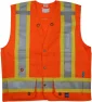 This garment has 150D polyester twill material with double hemstitched pockets and seams to increase wear resistance from washing, with built to last heavy-duty brass snaps and grommets. Other features include mesh side vents, dual reflective chest straps, cell/radio pocket with hook-and-loop fastener, safety D-ring slot access on back, 14" zippered pack across entire back area, 8 pockets with hook-&-loop fasteners, Brass grommets on lower front pockets for surveyor tape, and not fire retardant. Complies with ANSI, CSA, ISEA.