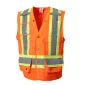 100% polyester. 5 point Velcro tear away safety design. Two reflective vertical stripes at the front of the vest. Two reflective stripes at the back of the vest that make an " X". One reflective s tripe at the waist. Double sewing on the silver reflective stripe and on the yellow band. Rustproof snaps. Two chest pockets. Five pockets at the waist. Back ruler pocket. Four pockets inside the vest. One big pocket at the back with a zipper. D-ring slot at the back of the vest. Radiophone clips.