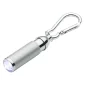 Bright LED light has pull on/off switch and a metal carabineer clip key chain. Powered by 3 LR44 button cell batteries, inserted. Complies with Prop 65. 2.125" L x 0.5" W x 0.875" H