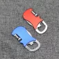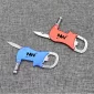 The material of this multifunction keychain is stainless steel. It is a three-in-one tool. Contains a knife, flashlight and corkscrew. Very suitable for carrying out. The shape, material, color and size of the logo can be customized. 3.5" L x 1.5" W