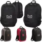 Tough 600D backpack with padded laptop sleeve, fleece-lined eyewear/media pocket, interior organizer panel, and mesh water bottle pockets. Padded adjustable shoulder straps. 20L capacity. Mill#921056ODM. 12 1/2" W x 5" D x 19" H