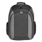 This bag is made of durable 1680D ballistic polyester. It features a padded back panel and comfort shoulder straps with a padded laptop compartment that fits laptops up to 17". A second main compartment includes a padded file divider. The front pocket features organizer section, soft lined easy access valuables pocket/media pocket with headphone grommet. The bag also features a side accessory pocket and side mesh bottle holder. Complies with CCPSA, CPSIA, FDA, Prop 65. 14.5" L x 9.5" W x 19" H