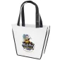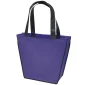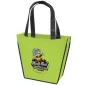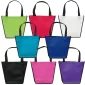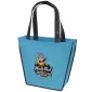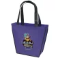 Stand out from the crowd with the Carnival Tote's unique trapezoid shape. The Carnival Tote is made with 80 GSM premium non-woven material, black handles, black accent piping, and plastic bottom insert. Complies with CPSIA, FDA, Prop 65. 12" W x 4" D x 10" H