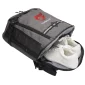 Polyester 300D/PVC Heather 7P, 300D/PVC 7P, 210D/PU, and Square Ripstop laminated PU exterior coating. Features laptop compartment (17"), 2 zippered accessory compartments & lockable zipper heads. Felt lined top zippered pocket, zippered front pocket, bottom shoe compartment, zippered hideaway bottle pocket, top handle, 2 side handles, side straps w/ buckle closures, rubberized padded back, back luggage handle, adjustable shoulder straps and sternum strap, front daisy chain, and reflective trim. 8" D x 14" W x 19" H