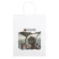 These popular white kraft-paper shoppers are functional, affordable and available in small to medium sizes. Include matching twisted paper handles and serrated cut top. Complies with CPSIA, FDA. 10" W x 5" D x 13" H