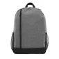 A stylish and versatile backpack for any adventure or day trip. The main compartment has a zipper closure, keeping contents securely in place, while the two outside mesh pockets allow for quick and easy access to frequently used items like a water bottle or pen. This backpack has sturdy adjustable straps and a carrying loop at top. A heather gray material is predominately featured on this backpack along with black accent panels. Customize with your choice of trim color. Complies with Prop 65. 11" L x 15.5" W x 5.5" D