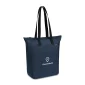 A modern and sustainable update to a classic tote bag using recycled fabric and webbing made from plastic bottles. Front slash pocket for storing accessories. Zippered opening to large main compartment. Interior zippered pockets for additional storage. 24.5" shoulder straps. This product is kid-friendly/CPSIA compliant. Complies with CPSIA, Prop 65. 5" W x 15" H x 11" L