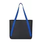 A modern and sustainable update to a classic tote bag using recycled fabric and webbing made from plastic bottles. Front hidden zippered pocket. 25.75" shoulder straps. This product is kid-friendly/CPSIA compliant. PVC Free Product. Complies with CPSIA, Prop 65. 4.5" W x 17" H x 13" L