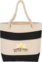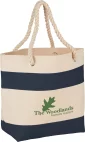 The Rope Handle 16oz Cotton Canvas Tote has an open main cotton compartment with a colored stripe accent and 10" rope handles. 6.75" D x 18.50" W x 13.50" H