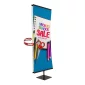 This display features a durable steel frame with a long-lasting, powder-coated finish. 13" x 13" base. Telescoping pole with thumbscrew lets you adjust the hardware for custom banner sizes. Banner attaches to the pole with snap rails for a clean finish (four snap rails included in kit). Your artwork will be printed on Titan 11 mil polyester. Display can hold one or two banners. One-year warranty. Complies with Prop 65. 13.25" L x 30" W x 92" H