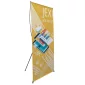 This lightweight display is stable and easy to set up, with sturdy, aluminum bottom legs and removable plastic top arms. Lightweight plastic hub offers push-button arm adjustment. Your artwork will be printed on Titan 13 oz. smooth scrim vinyl. Banner features brass #2 grommets (can be customized with nickel or clear plastic grommets by request). Corner grommets attach to plastic hooks on display legs. 60-day warranty on hardware, one-year warranty on banner. Carry case included. Complies with Prop 65. 14" L x 40" W x 75" H
