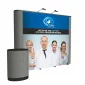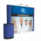 This pop-up display is specifically engineered for the trade show professional. Center panels include full-color artwork printed on Titan no-curl laminated media; end panels feature high-quality loop fabric. Magnet bars connect to frame to hold panels in place. High-grade aluminum frame with medium-weight nylon connecting hubs. Self-locking frame pops up in seconds. Case-to-Counter Conversion Kit and LED lights included. Lifetime warranty on hardware. Complies with Prop 65. 12.5" L x 109.5" W x 89.5" H