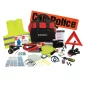Constructed of heavy duty, water and puncture resistant 600D Polyester, this Deluxe WideMouth Bag features lower zippered pocket for booster cable, shoes and other personal items storage, 2 large outside pockets, and reinforced handles. Contents: 6- Cable Ties, 2 Heavy Duty "D" Batteries, Emergency Blanket, Pair Vinyl Gloves, PVC Black Tape, Tie-Down Strap, Emergency Plug-In Fuses.+,2 Light Sticks Foam Knee Pad, 24 hr Roadside Assistance Card (Up to $180 value) and more! 12.5" L x 9.25" W x 12" H