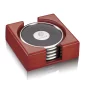 Spectacular Chrome rimmed coasters with black leatherette or Gold rimmed coasters with brown leatherette.Laser engraved on Chrome or Gold medallion inset. Comes in a cherry wood holder.A marvelous gift for that special client or employee.