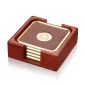 Spectacular Set of 4 Chrome rimmed coasters with black leatherette. Gold rimmed coasters with brown leatherette also available.Laser engraved on Chrome medallion inset. Comes in a cherry wood holder.A marvelous gift for that special client or employee. 4.0" H