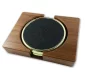 Set of 2 shiny heavy weight coasters (with genuine bonded leather insert) in a Walnut Holder. Decoration on the coasters only (Deboss or Foil Stamp). Holder size is 4"d x 5"w x 0.6"h). Coasters are 3.5"dia