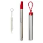 This set includes a reusable stainless steel drinking straw with a cleaning brush in a PS plastic case. Telescopic 304 stainless steel straw with silicone spout is compact for using on-the-go. Case includes silicone clip on lid. Brush comes inserted at silicone spout end of folded straw and is made of stainless steel with nylon yarn. Complies with Prop 65. 6" L x 0.6" Diameter