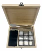 Stainless Steel 9 pack Ice cube Whiskey stones set in wooden Gift Box. Reusable Ice cubes for Whiskey, Vodka, Liqueurs, Wine, Beverages, Juice and Soda. Includes tong, storage velvet pouch and an beautiful wooden box. 6" H x 4 34" W x 1 1/2" D